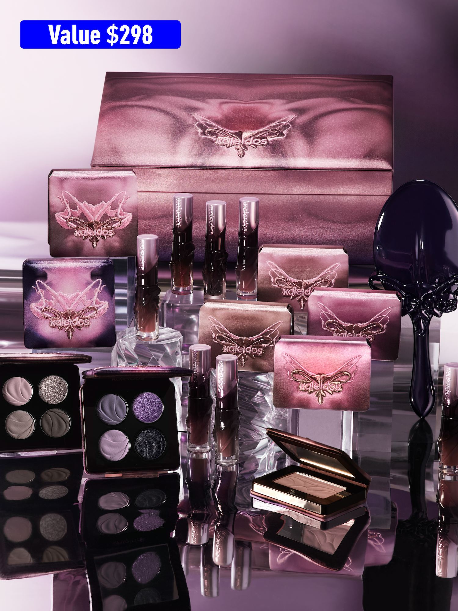 Captures the spirit and essence of divine desire with chic color and shine. Soft, blush-toned pinks, muted mauves, and cool, gunmetal browns beautifully accentuate the contours of the eye with coordinated shadowplay. Swanky, silver shimmers build from strobed veils of sparkle to an explosive, arc of light shine.