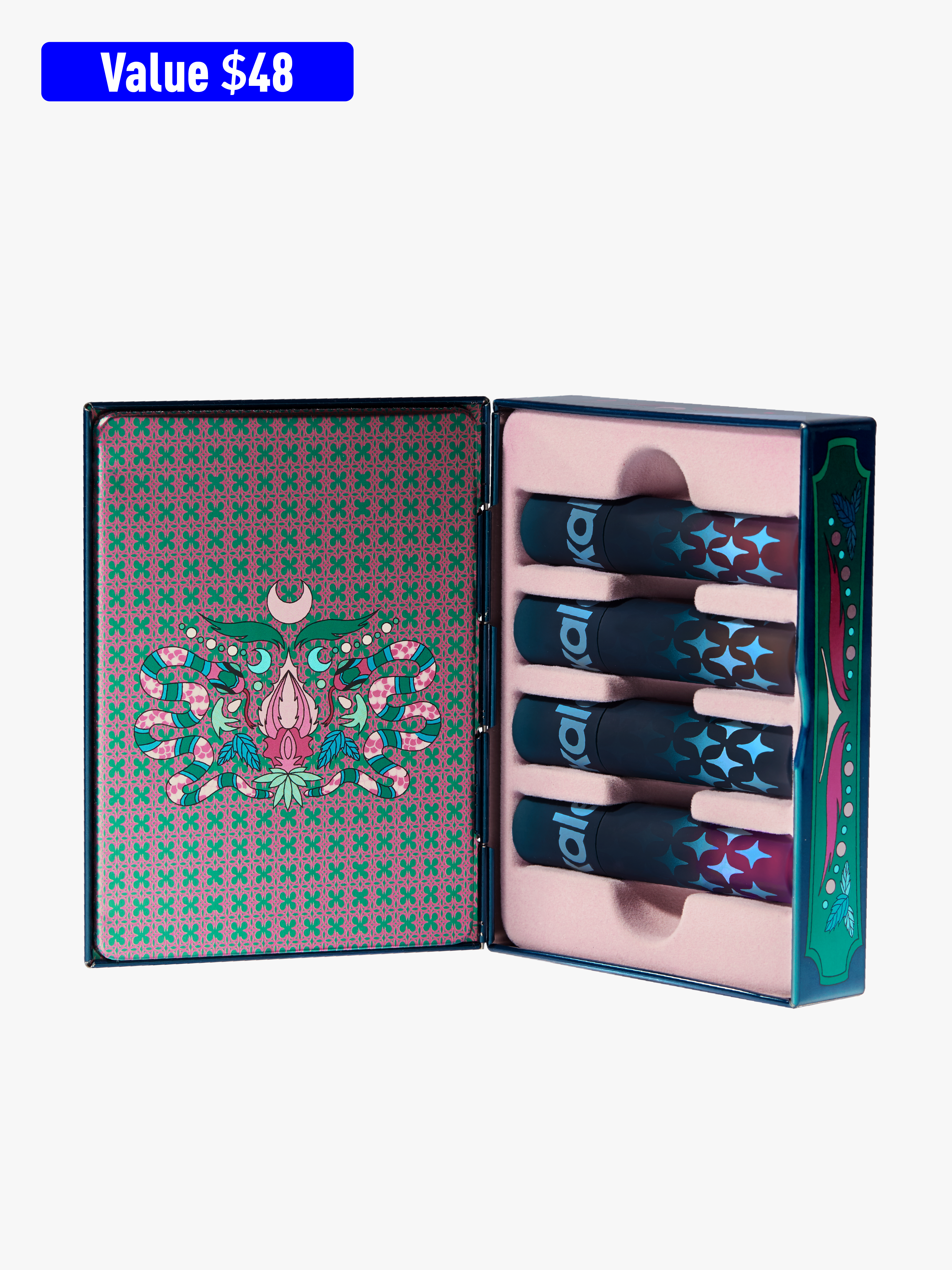 A garden of four grungy lip clays for adding a rich, powerful punch to your look. This vault includes one bright fuchsia, one navy teal, one soft mahogany, and one cool maroon. Sharpen your senses and suit up for adventure with this wild assortment of bold and highly saturated lip clays.