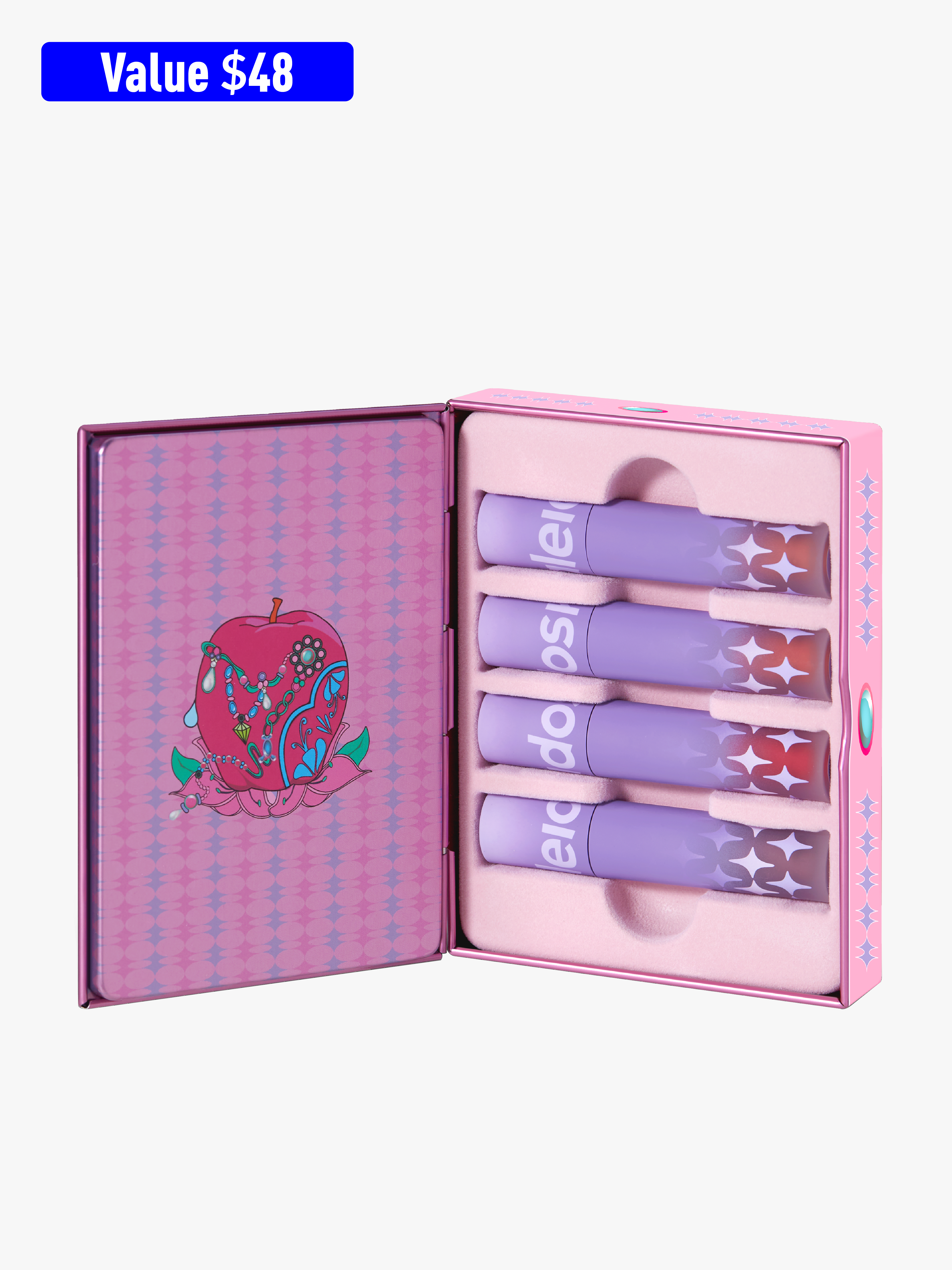 A bouquet of delicate, soft lip clays to lend a dreamy air to any look. Includes one pink champagne, one heather rose, one deep mulberry, and one dusty plum shade. Treat yourself to a slice of carefree decadence and indulge in the mellow perfection of these laid-back, charming lip clays.