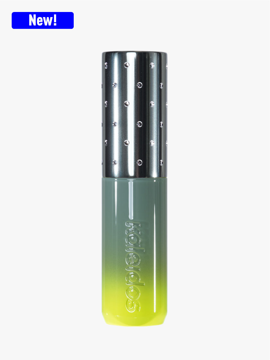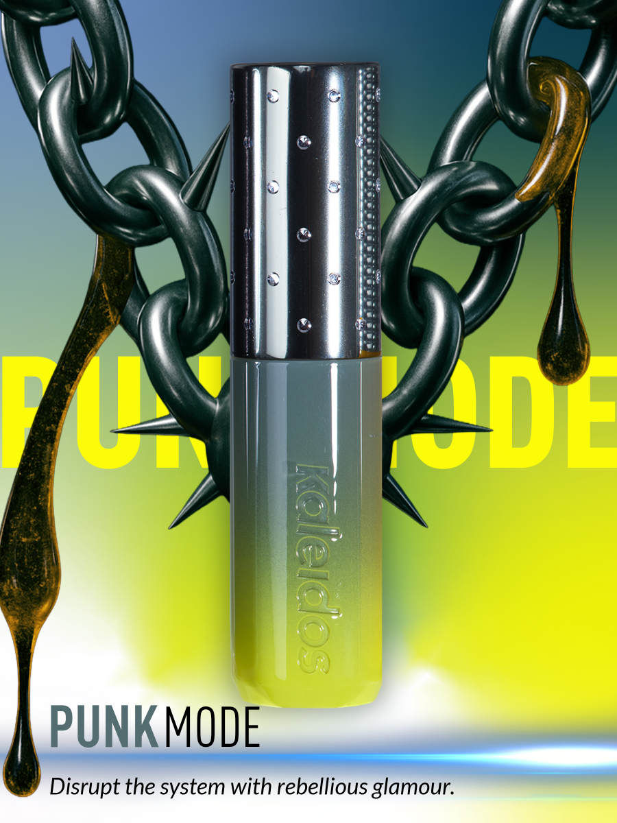A blue-grey to olive yellow gradient bottle, topped with a gunmetal metallic cap embellished with rhinestone studs. Disrupt the system with rebellious glamour.