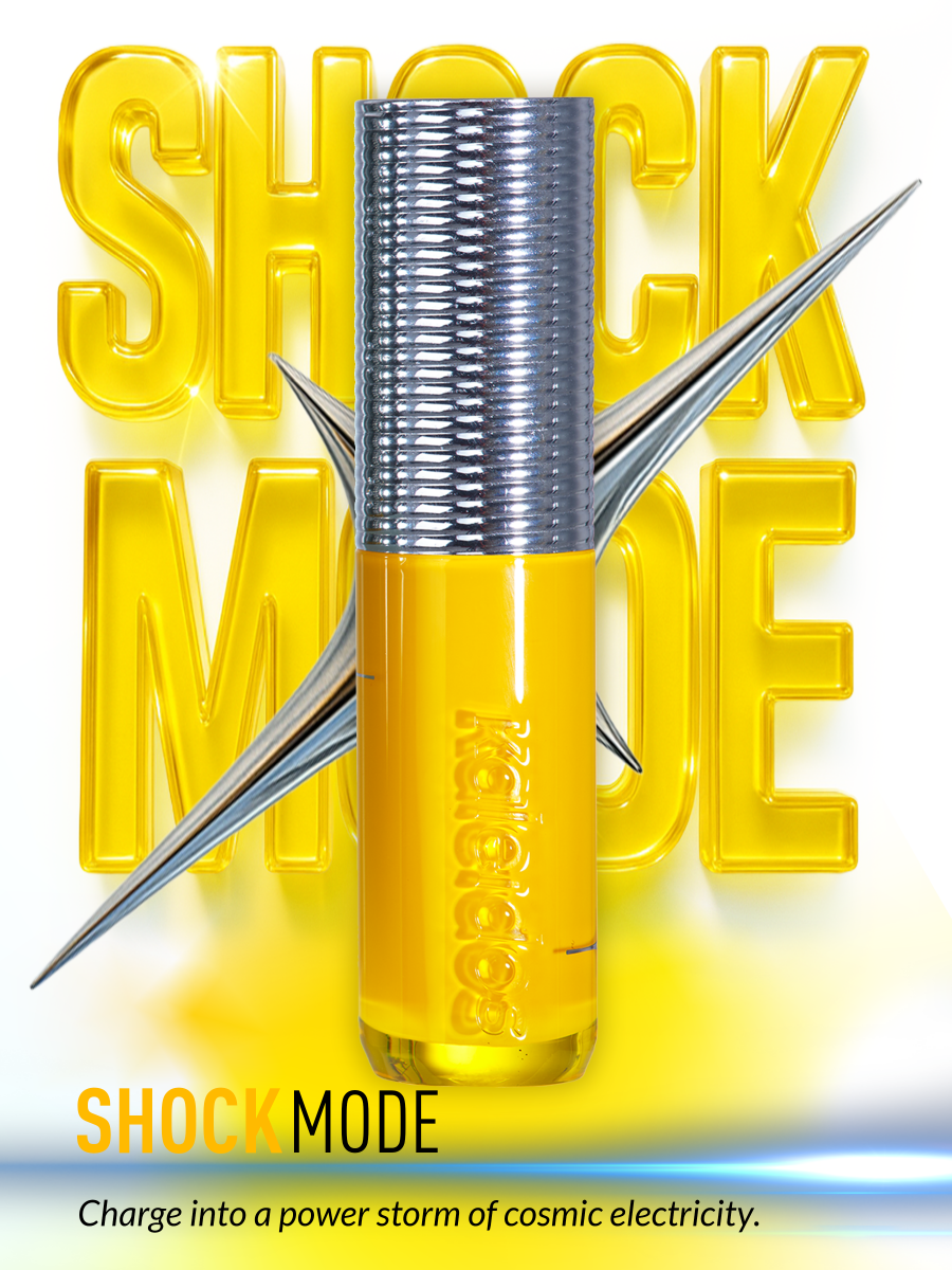 A vibrant yellow bottle with silver star sparks, topped with a chrome cap etched in an electric coil texture. Charge into a power storm of cosmic electricity.